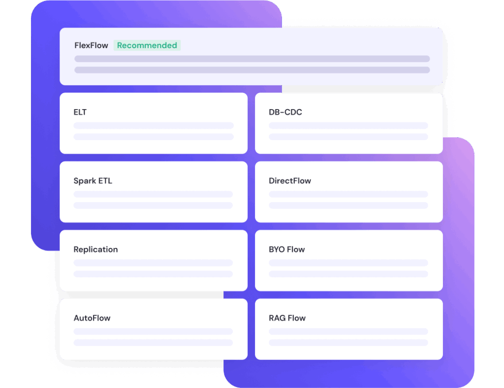With Nexla you can reuse the same CDC connection and Nexset across all styles of integration – ELT/ETL, change data capture (CDC), replication, R-ETL, API integration, streaming, (S)FTP, GenAI RAG, bring your own (BYO) integration, and more.
